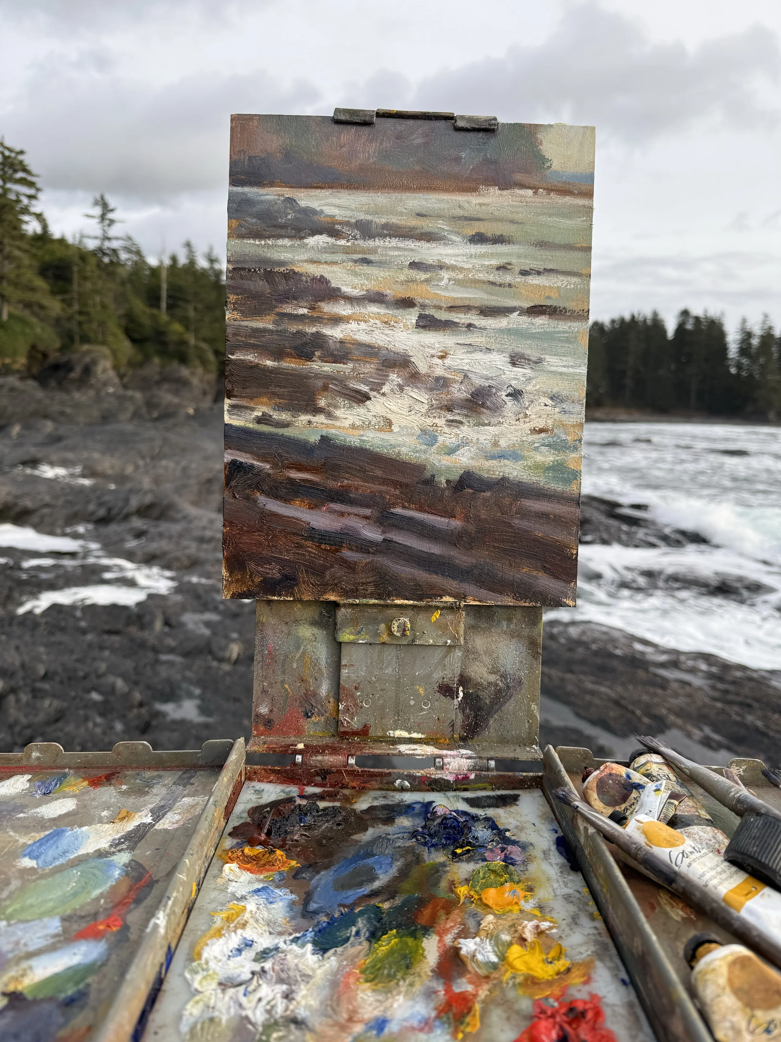 Its been unseasonable warm this winter on Vancouver island. It has given me an opportunity to explore some hidden spots. Port Renfrew’s Pacheedaht Beach and just down the way, Botanical Beach on the west coast of Vancouver island inspired some moody, tonal and haunting paintings, en plein air.